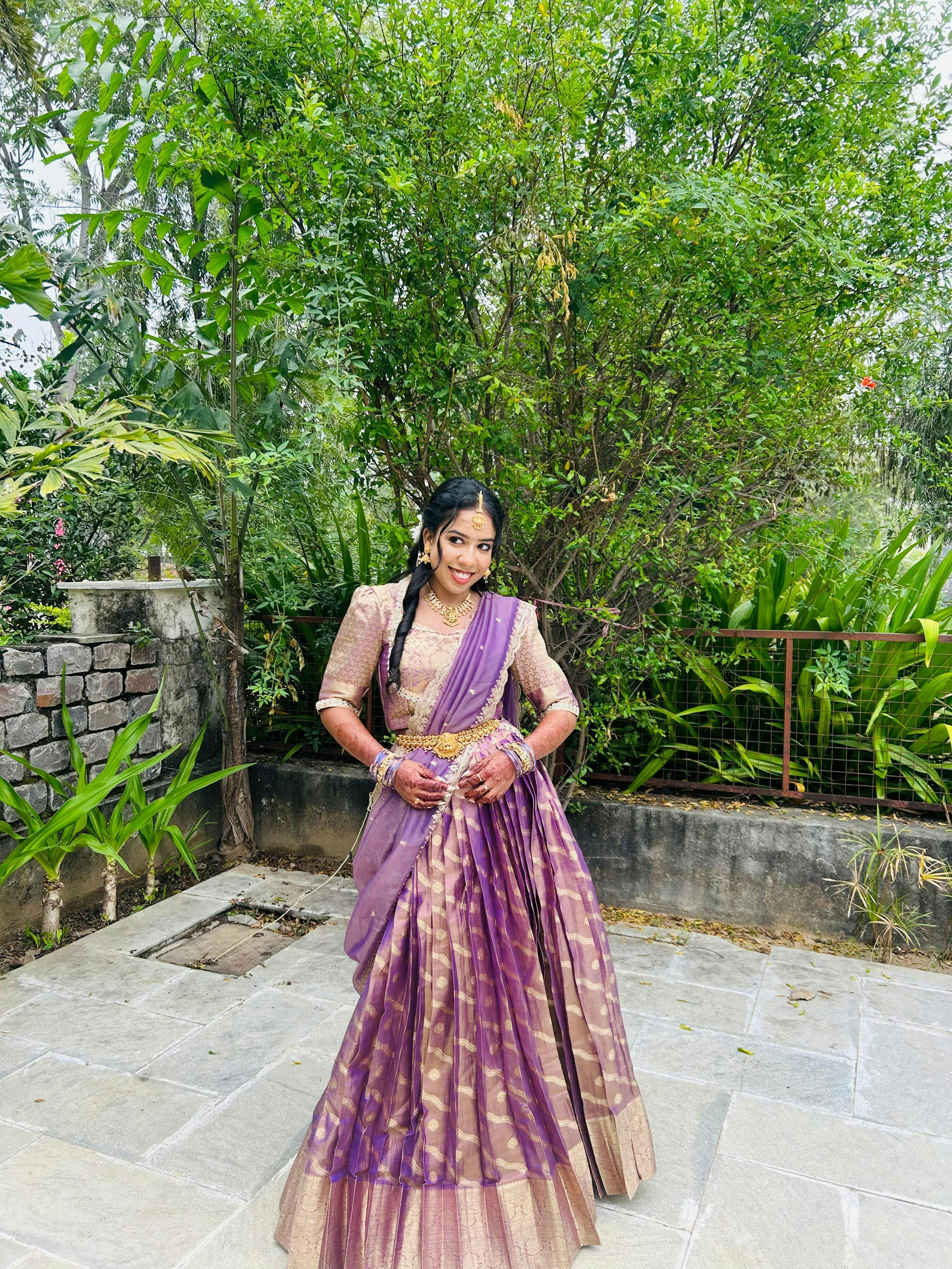 Get ready to attend family functions and traditional celebrations of events with our beautiful Urja Tissue Zari Lehenga Set in purple, made from comfortable and soft fabric for easy carrying. This lehenga set has a golden blouse featuring a scooped neckline with a Madhubala pattern at the front and an open drop shape at the back. The purple pleated skirt with golden pattu border and matching purple dupatta has a scalloped pattern with embroidery work on it. This lehenga set is ideal for festivals, informal get-togethers, and traditional occasions. This outfit looks outstanding when paired with gold or silver jewellery.