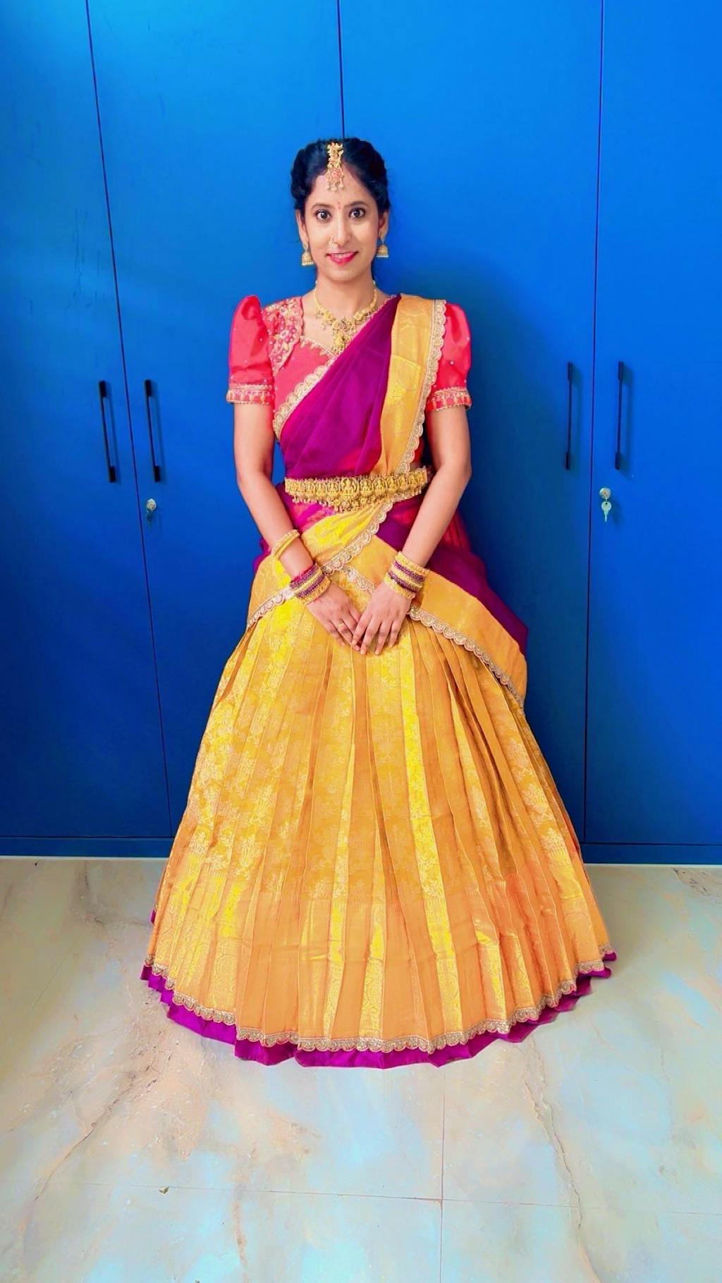 This purple-yellow and red Twisha Banarasi Lehenga Set is a perfect color palette for this festive season, crafted in rich Banarasi and Dola Silk material. This beautiful lehenga set is crafted in yellow Banarasi silk fabric with a hint of purple lace border at the end. A little pop of colour gives it a stunning look. In this lehenga set, the blouse is crafted in Dola Silk with a hint of old puff sleeves, highlighting hand embroidery on the yoke, shoulder, and sleeves. The standout feature of this lehenga is the beautiful contrasting dupatta with a yellow pattu border, lace detailing, and purple organza, making it a perfect festive lehenga.