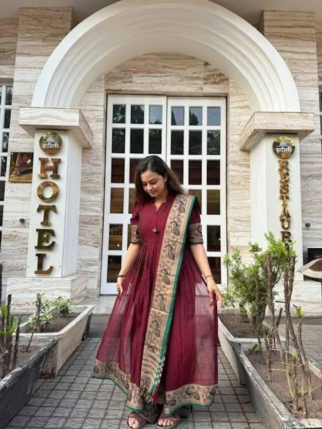 Are you looking for a comfortable yet classy kurta set? Then look at the most comfortable and perfect Ruhana Kurta Set in Maroon. This outfit is in a vibrant maroon color. Featuring a unique V-neckline with a front gathering that ensures comfort while enhancing the dress's movement, making it perfect for every body type. The puffy sleeves, dupatta, and even the bottom have the same contrast-matching thread weaving of peacock motifs design at the edge of the cotton handloom fabric. Adding a casual and festive vibe, this kurta set is perfect for formal occasions.