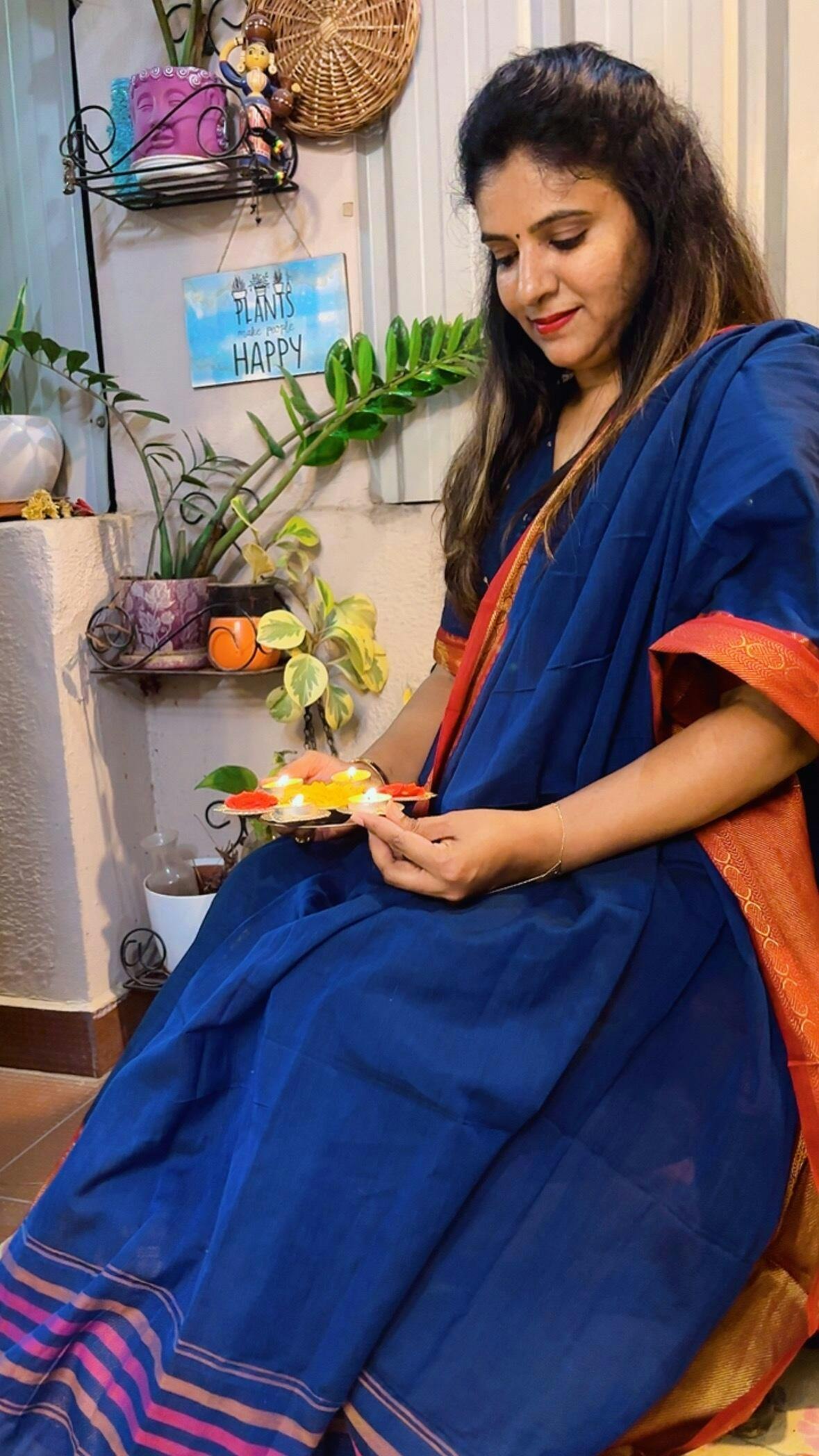 Woman wearing a blue traditional outfit with gold embroidery, posing against a blurred background.