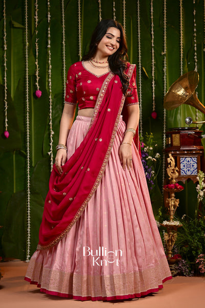 Speciality: Features with a rich pink and red colour palette. The blouse is heavily handcrafted, and the dupatta is hand-embroidered.
