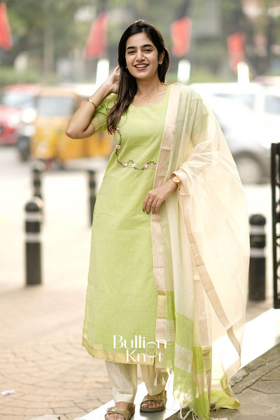 This lovely Amodini Lime Green Mangalagiri Cotton Suit Set is a perfect mix of traditional and elegant style, great for many special occasions. The kurta features soft hand-embroidered pink floral motifs around the neck and waist, along with trendy puff sleeves and a light golden border. It comes with comfortable off-white straight pants and an off-white dupatta with a neat golden border. This outfit is a versatile choice for family functions, festivals, weddings, or even a simple, modest temple visit. Made with breathable fabric and a beautiful look, this suit set helps you feel comfortable and look graceful all day.