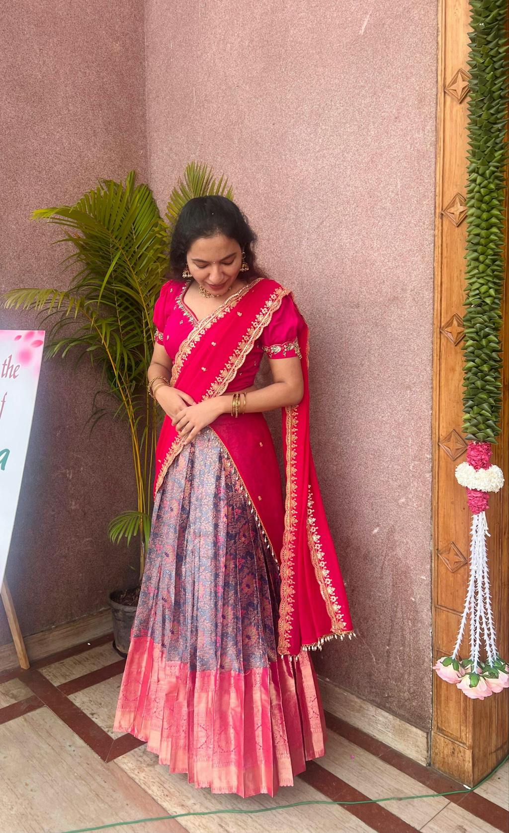 Step into your dream look with this Rithvika lehenga set, handcrafted with soft banarasi fabric. The pink blouse features with sweetheart neckline intricately with contrasting handwork. A beautiful maggam works on puff sleeves and backside neckline patterns. The grey pleated pattu skirt is flowy and has a floral print making it comfortable for the whole day long. The matching dupatta is all about embroidery work with a scalloped pattern. Designed to make you shine at any festival or wedding event, or special occasion.