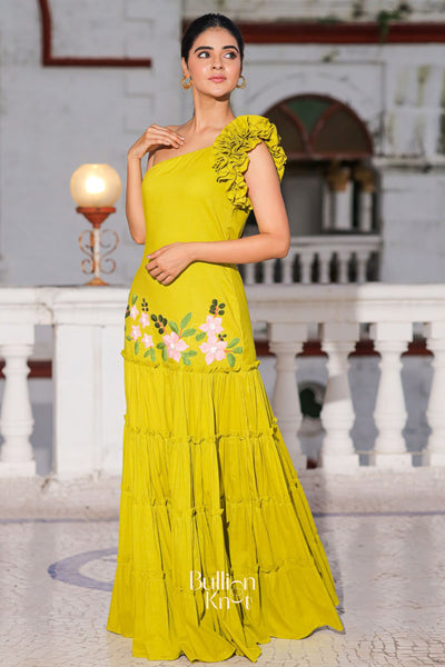 Explore yourself in this Birdy flower re-sort wear maxi dress in Lime Green. Wear a lime green maxi dress with ruffled sleeve, floral detail on one shoulder and floral handwork near the waist. The pure cotton maxi dress has four layers at the bottom that add volume and texture. The look is elegant, keeping accessories of your choice minimal to complement the dress style. The unique pattern re-sort wear creates a charming look and is perfect for daytime events, garden parties, or vacation moods. (Side Zip Attached)