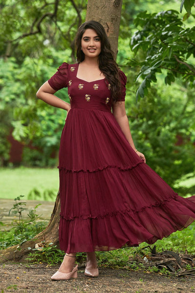 Style this super gorgeous Boysenberry Midi Dress and be a surprise! Crafted with pure Georgette Silk fabric and flowy silhouettes, this Dress will elevate your fashion quotient instantly with a Flower hand embroidery in Yok part!!!