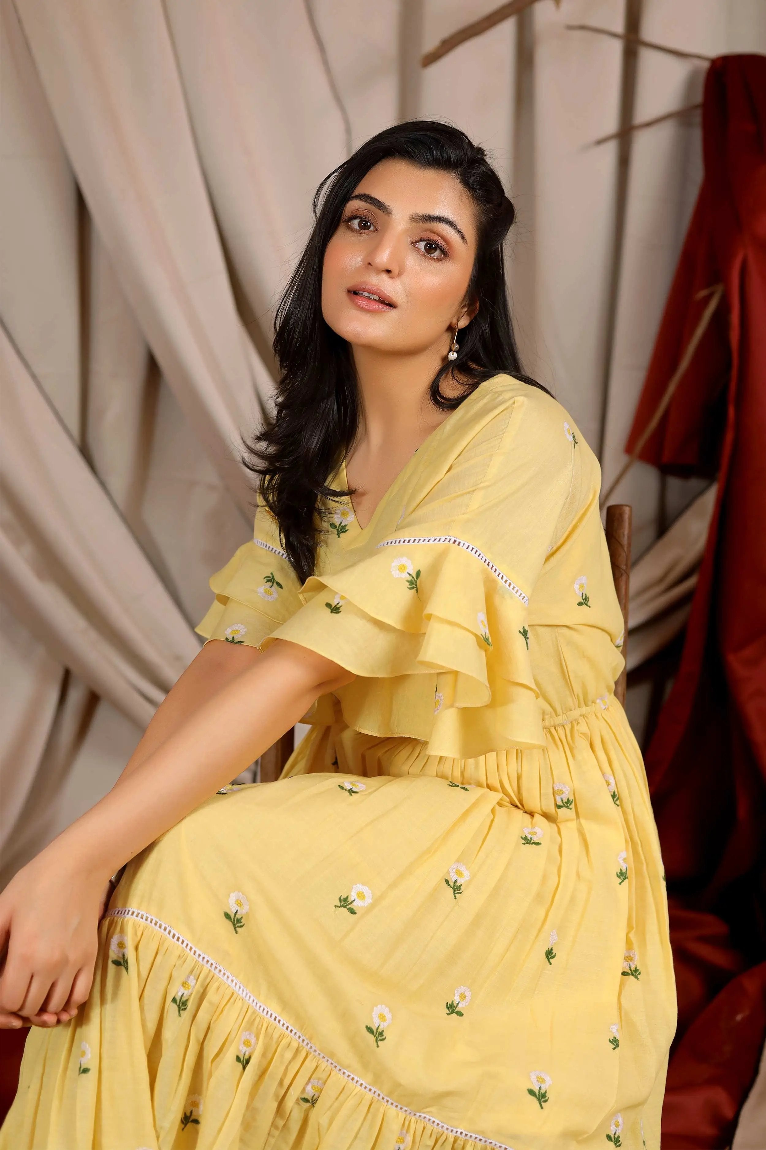 Introducing our delightful Cotton Midi Dress with Daisy Flower Motif Thread Embroidery, now available in a charming vanilla yellow hue! Elevate your summer wardrobe with this enchanting piece that combines style and comfort effortlessly. Crafted from premium quality cotton, this dress features intricate daisy flower motif thread embroidery, adding a touch of whimsy and elegance to your look. The comfortable fit silhouette ensures a flattering and relaxed fit, while the short ruffle sleeves add a playful and feminine touch.