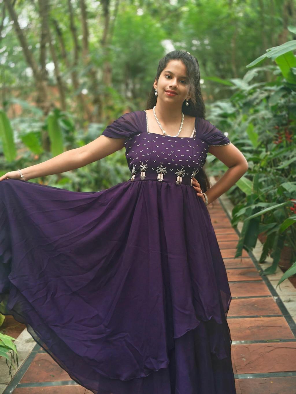 Explore your style with this stunning purple Zara chiffon gown! Featuring handcrafted details on the yoke, a flattering square neckline, and fancy pleated sleeves, it adds a beautiful and elegant touch to your look. The two-layered flared design enhances the gown’s flow, giving it a graceful, flattering silhouette. This gown is perfect for a friend's engagement party, pool party, or any special occasion, offering elegance and charm for unforgettable moments.