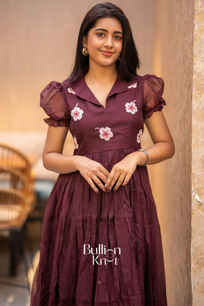 Grace meets effortless charm in this deep plum midi dress, crafted in breathable mul cotton for all-day comfort. Delicate floral hand embroidery adds an artisanal touch, while the soft V-collar neckline and sheer puff sleeves enhance its feminine appeal. Finished with a flowy pleated flare, this timeless piece moves beautifully and transitions seamlessly from relaxed daytime outings to intimate evening gatherings.