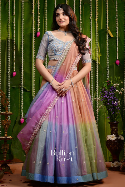 Vasundhara is not a lehenga you describe easily. The pure organza skirt moves through a full rainbow ombre peach melting into lavender, into sage green, into powder blue all in one continuous wash of colour that shifts with every step and every angle of light. The powder blue organza blouse is covered almost entirely in heavy silver hand embellishment floral lattice, vine trails, pink bead accents so densely worked it catches light like jewellery. Scattered silver motifs float across the 5-metre skirt. The matching ombre dupatta frames it all. This is the lehenga women screenshot and save for years before they finally wear it.
