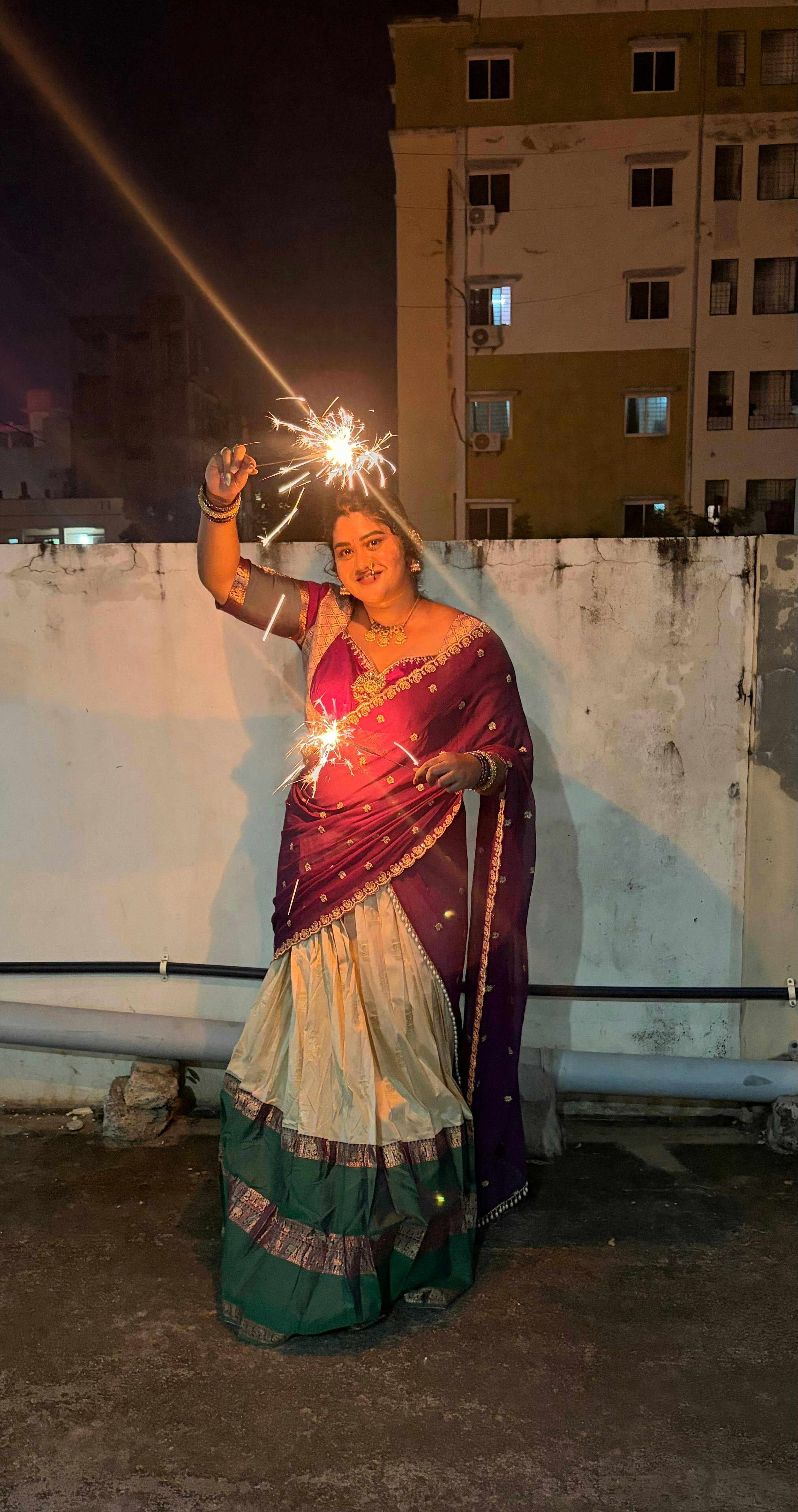 Rooted in tradition yet made for today’s queen, this Vishakha Half Saree is a beauty to timeless South Indian elegance. The rich cream pleated silk skirt is gracefully bordered with deep green and royal maroon zari work, displaying beauty in every fold. In this half saree blouse, crafted in a bold wine-purple hue with traditional maggam work with open back, a perfect pair with the matching purple Georgette dupatta, finished with golden embroidery work. Every detail whispers royalty — this half saree not just worn, but celebrated the legacy.